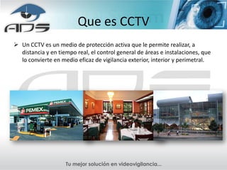 Este documento describe los sistemas de CCTV, incluyendo sus aplicaciones principales, ventajas y tipos. CCTV permite la vigilancia remota y en tiempo real de áreas e instalaciones para mayor seguridad. Se usa comúnmente en bancos, gobiernos, tiendas y más. Ofrece beneficios como mayor seguridad, productividad y control del personal. Existen sistemas analógicos y digitales, y factores como la cantidad de cámaras, ubicación e iluminación deben considerarse para una instalación efectiva.