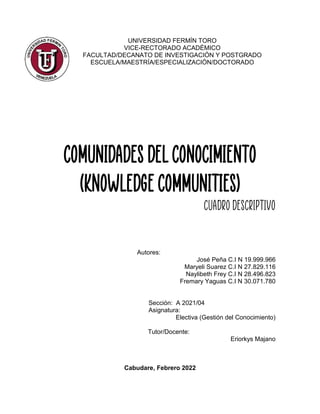 Este documento describe las comunidades de conocimiento, las cuales son grupos de personas que comparten información, ideas y experiencias para construir conocimiento de forma social. Las comunidades de conocimiento tienen como objetivo promover la difusión del conocimiento en la sociedad para impulsar el desarrollo a través del aprendizaje compartido y el uso de herramientas tecnológicas. El documento también discute métodos y factores clave para implementar con éxito las comunidades de conocimiento en las organizaciones.