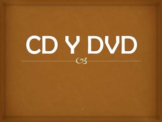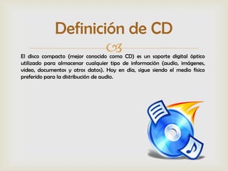 El documento define los discos compactos (CD) y DVD, sus características y su historia. Los CD pueden almacenar hasta 80 minutos de audio u 700MB de datos, mientras que los DVD pueden almacenar hasta 4.7GB. Philips y Sony desarrollaron los CD en 1980, mientras que los DVD fueron desarrollados en los años 1990 por Philips, Sony, Toshiba y otros como un formato de almacenamiento óptico de alta densidad.