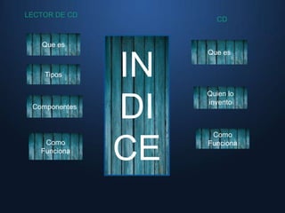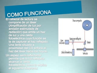 El documento describe cómo funciona un lector de CD. Explica que un lector de CD usa un rayo láser para leer los datos digitales almacenados en forma de pozos y llanos en un disco compacto. Mientras el láser se mueve a lo largo de la pista espiral, detecta los pozos y llanos como unos y ceros respectivamente. El lector gira el disco y ajusta la velocidad de rotación para mantener una velocidad de lectura constante a medida que el láser se mueve hacia el exterior del disco. También