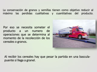 El documento aborda la conservación de cereales y granos, destacando la importancia de una serie de operaciones desde la recolección hasta el almacenamiento para minimizar pérdidas cualitativas y cuantitativas. Incluye procesos como limpieza, clasificación y control de plagas, enfatizando la necesidad de un manejo adecuado para evitar daños en los granos y asegurar su calidad. Además, se mencionan diferentes tipos de transportadores utilizados en el manejo de los productos para facilitar su traslado y almacenamiento.