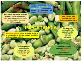 El cultivo de haba (Vicia faba L.) es esencial en la sierra por su valor nutricional y económico, proporcionando alimento y forraje, además de ser vital para la población rural. Su cultivo presenta diversas características agronómicas, que incluye la mejora genética, la preparación del suelo, la gestión de riego y el control de plagas y enfermedades para optimizar rendimiento y calidad del grano. Las prácticas de post cosecha son fundamentales para cumplir con estándares de calidad y mejorar la presentación del producto.