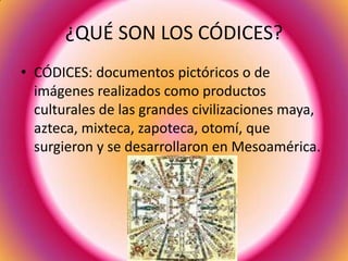Los códices eran documentos pictóricos creados por las civilizaciones mesoamericanas para registrar su conocimiento, historia, rituales y otros aspectos culturales. Eran pintados por tlacuilos sobre materiales como papel amate o piel y contenían pictogramas, ideogramas y glifos. La mayoría fueron destruidos por los españoles pero algunos sobrevivieron y ahora se encuentran en instituciones de Europa y Estados Unidos. Los códices han sido una fuente importante para el estudio de las culturas prehispánicas.