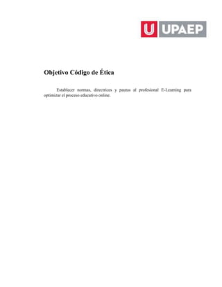 Este documento establece un código de ética y conducta para profesionales de e-learning. Define la ética como la disciplina filosófica que analiza conceptos morales y justifica enunciados morales. Luego, presenta los principios éticos que deben guiar a los profesionales, como tratar a todos los estudiantes de manera imparcial y respetuosa, mantener actualizaciones continuas, y fomentar el pensamiento crítico. También describe las responsabilidades de los profesionales, como diagnosticar conocimientos, elegir herram