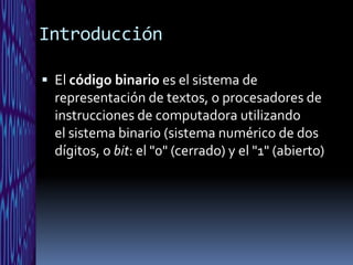 El código binario representa textos e instrucciones de computadoras usando los dígitos 0 y 1. Los números binarios se escriben en grupos de 4, 8, 16 o más bits completados con ceros. Para convertir un número decimal a binario, se divide repetidamente entre 2 hasta obtener un cociente menor que el divisor, ordenando luego los restos de mayor a menor para formar el número binario equivalente. El alfabeto también se representa binariamente asignando un número a cada letra y convirtiéndolo a binario.