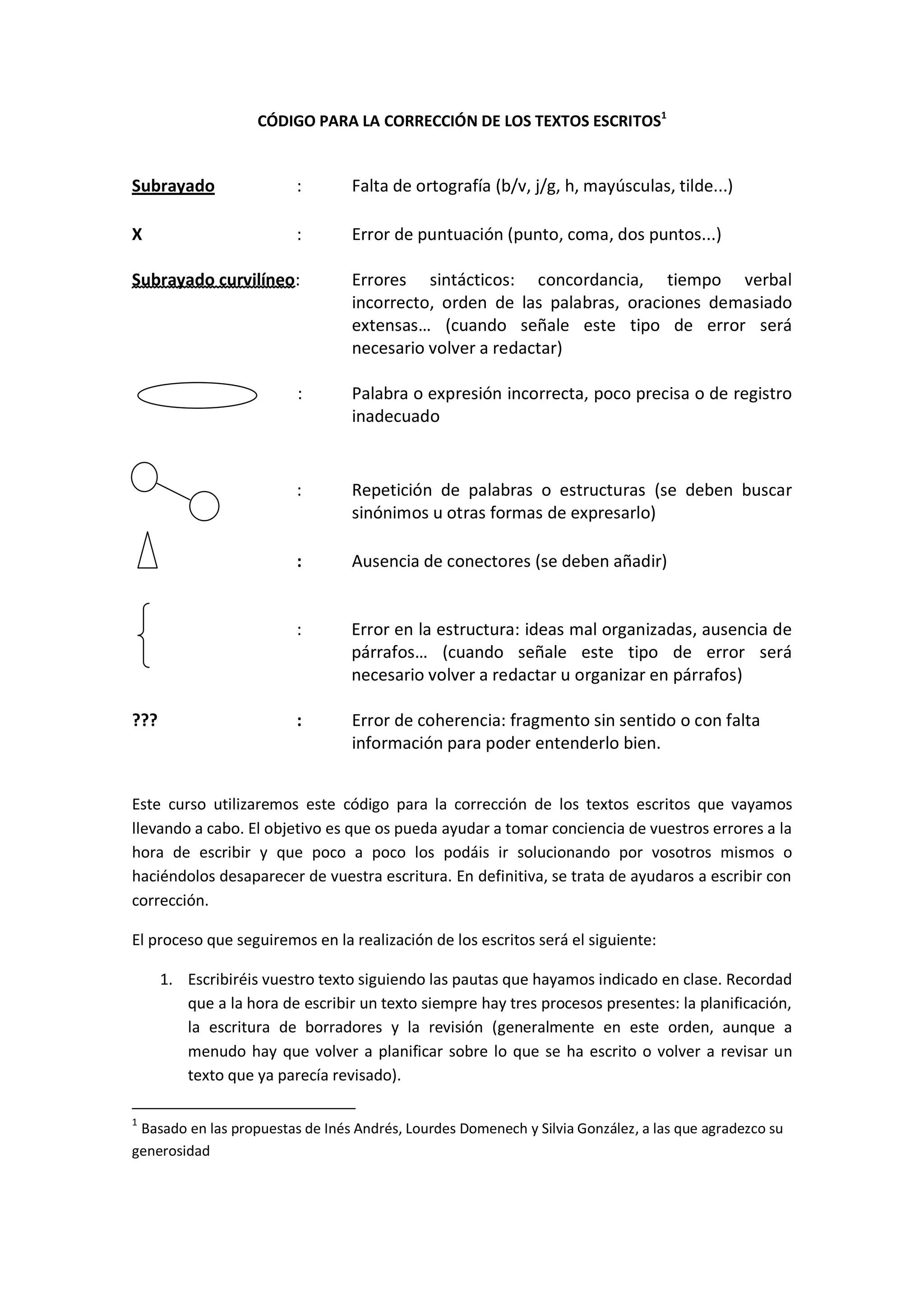 Este documento presenta un código para la corrección de textos escritos que incluye símbolos para señalar diferentes tipos de errores como ortografía, puntuación, sintaxis, coherencia y organización. El profesor utilizará este código para revisar borradores de los estudiantes y devolverlos con las correcciones marcadas, para que los estudiantes puedan mejorar sus habilidades de escritura corrigiendo los errores señalados y entregando una versión final. El proceso implica varios pasos como la planific