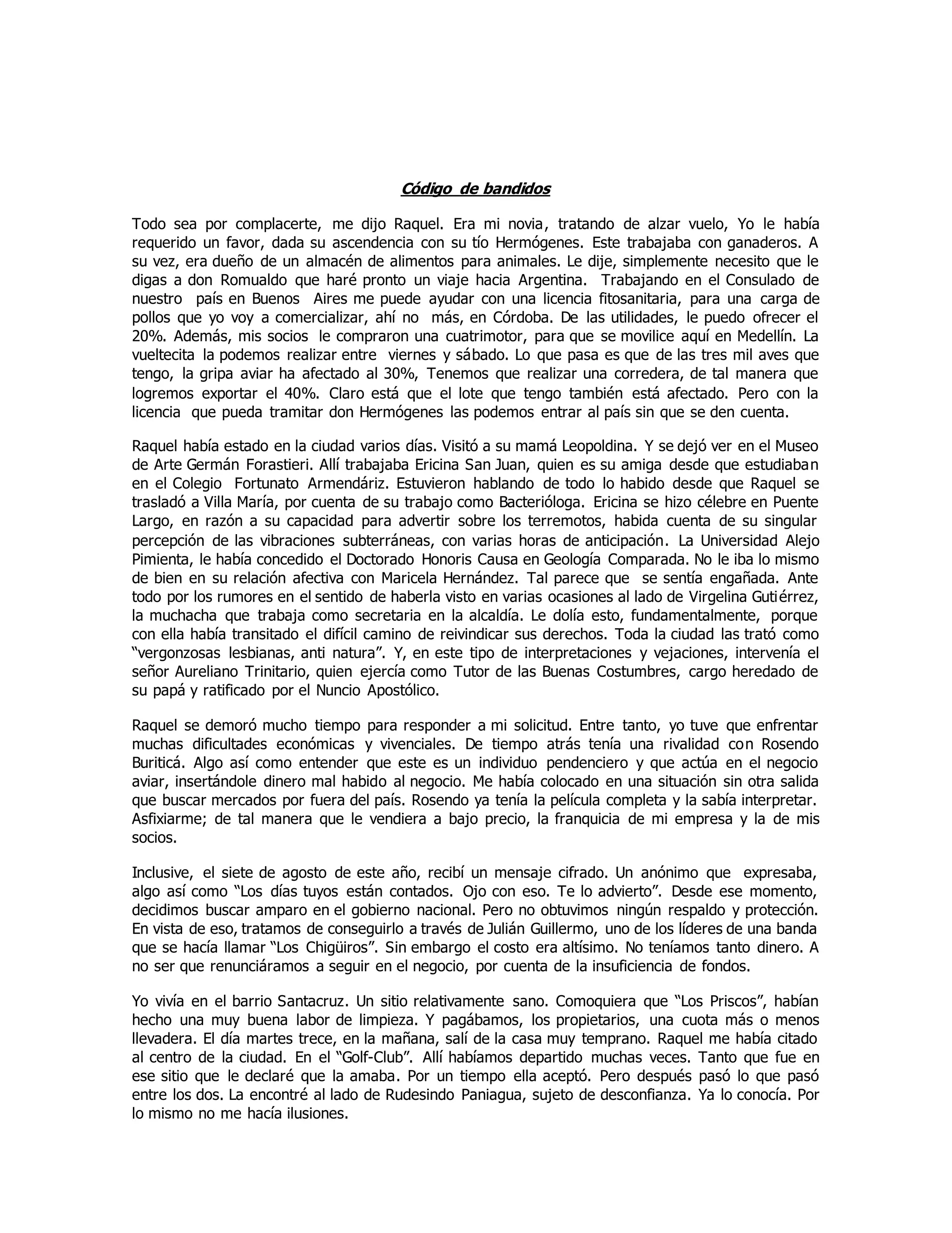 El documento narra la historia de un hombre que se ve envuelto en problemas económicos y de seguridad debido a su rivalidad con otro empresario avícola. Busca la ayuda de su novia Raquel y de líderes criminales para protegerse, pero termina siendo secuestrado y asesinado por orden del jefe de una banda criminal conocida como "El Patrón".
