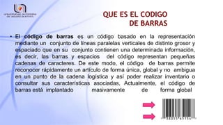 El documento proporciona información sobre los códigos de barras, incluyendo su definición como un código basado en líneas paralelas de distinto grosor que representan información, sus aplicaciones principales como control de inventario y punto de venta, y los beneficios que proporciona como la identificación única de productos y la optimización de procesos. También describe la estructura y tipos de códigos de barras, cómo son leídos y los sistemas y tipos de lectores disponibles.