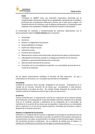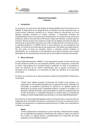 Este documento presenta una propuesta de Código de Ética para la Universidad Metropolitana (UNIMET). Explica que el código busca orientar las conductas de la comunidad universitaria basándose en valores como la honestidad, excelencia, respeto y responsabilidad. Describió el proceso de elaboración del código que incluyó entrevistas grupales con diferentes roles de la universidad. Finalmente, presenta el código de ética propuesto, el cual establece normas de comportamiento para todos los miembros de la comunidad unimetana en pro de la convivencia