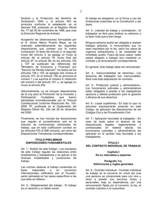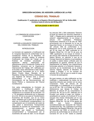 Este documento presenta la codificación más reciente del Código del Trabajo de Ecuador realizada por la Comisión de Legislación y Codificación del Congreso Nacional. En la codificación se incluyeron reformas legales y se armonizaron disposiciones con convenios internacionales ratificados por Ecuador. También se sistematizaron y renumeraron varios artículos para mejorar la organización y coherencia del Código. La nueva codificación busca mantener actualizada la legislación laboral ecuatoriana.