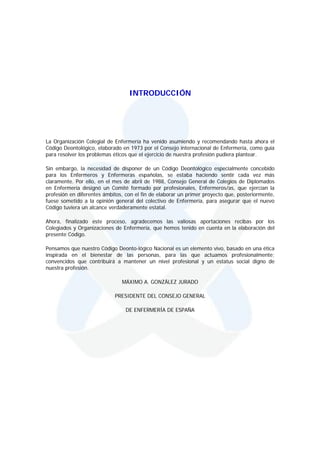 Este documento presenta el Código Deontológico de la Enfermería Española. Explica que se elaboró un nuevo código para reemplazar el anterior de 1973, con el objetivo de reflejar mejor las necesidades de los enfermeros españoles. Luego, resume los principales puntos del código, incluyendo que los enfermeros deben tratar a todos los pacientes con dignidad y respeto, obtener su consentimiento informado, y mantener la confidencialidad de la información sobre los pacientes.