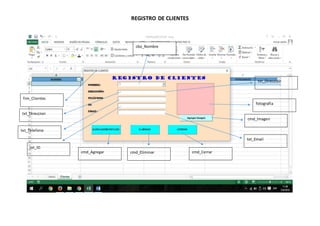 Este documento describe un sistema de registro de clientes en Visual Basic. Incluye código para agregar, eliminar y buscar registros de clientes, así como validar los campos de entrada. El sistema almacena información como nombre, dirección, teléfono y foto del cliente en una hoja llamada "Clientes". Ofrece funciones para cargar la lista desplegable de nombres, limpiar el formulario y seleccionar imágenes.