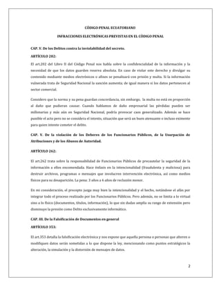Este documento resume varios artículos del Código Penal Ecuatoriano relacionados con delitos informáticos. El artículo 202 trata sobre la confidencialidad de la información y penaliza su divulgación no autorizada mediante medios electrónicos. El artículo 262 se refiere a la responsabilidad de los funcionarios públicos de proteger la información que se les ha encomendado. El artículo 353 penaliza la alteración o modificación ilegal de datos. El artículo 415 establece sanciones por la destrucción de información almacenada