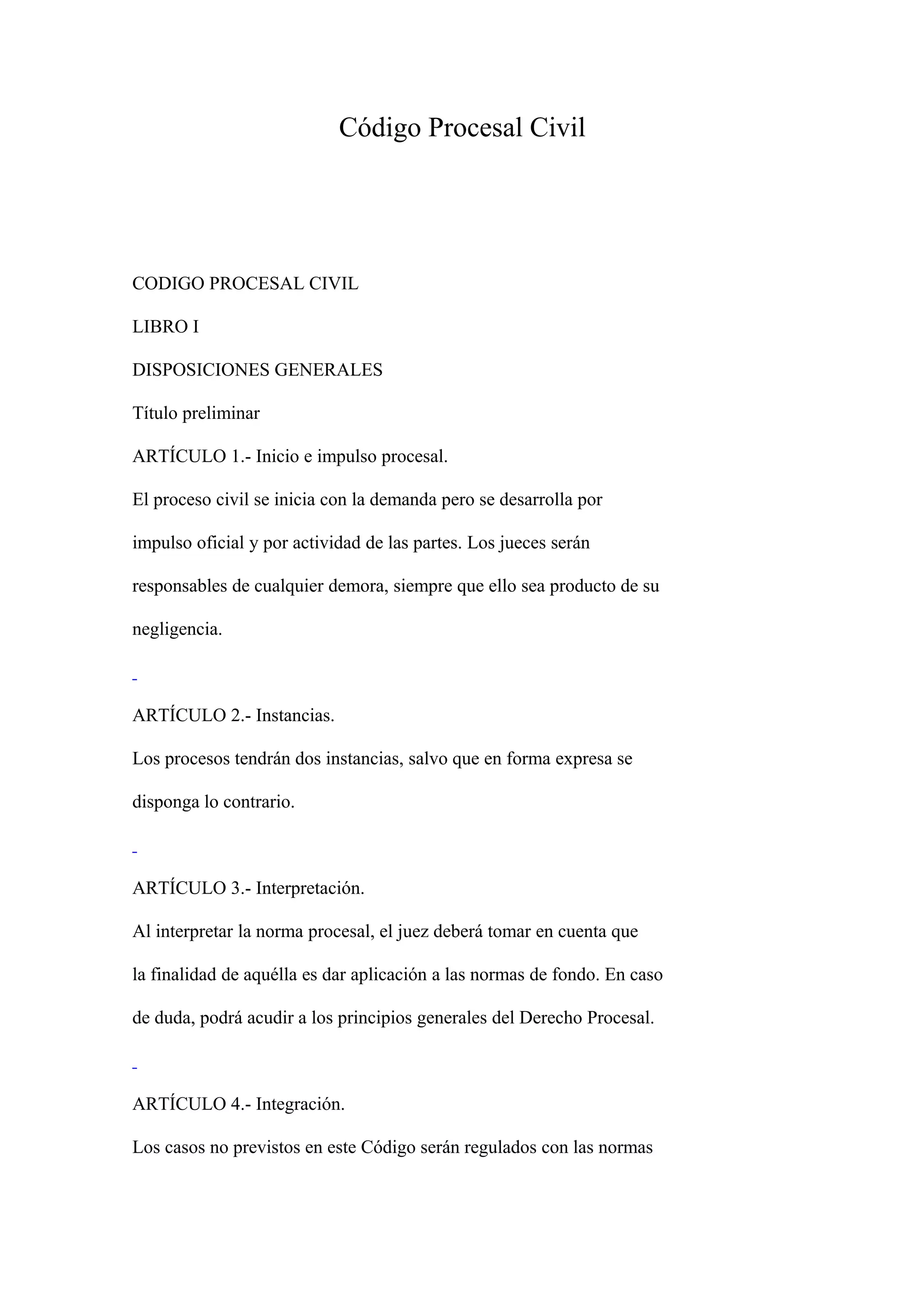 1) El documento presenta el Código Procesal Civil, el cual regula el proceso judicial civil en un país. 2) Establece disposiciones generales como las instancias, interpretación de normas procesales y observancia de las mismas. 3) También regula aspectos como jurisdicción, competencia por materia y cuantía, cálculo de la cuantía de las demandas y desacuerdos sobre la misma.