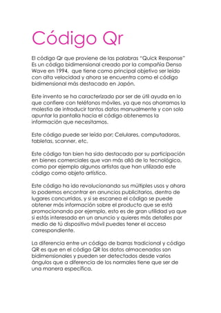 El código QR, creado en 1994 por la compañía Denso Wave, es un código bidimensional que puede ser leído rápidamente y se ha convertido en el código más popular en Japón. Este código ha revolucionado su uso en teléfonos móviles, publicidad y lugares públicos al permitir que los usuarios obtengan información adicional simplemente escaneando el código con su dispositivo. La principal diferencia entre un código QR y un código de barras tradicional es que el código QR almacena datos bidimensionales que pueden leerse
