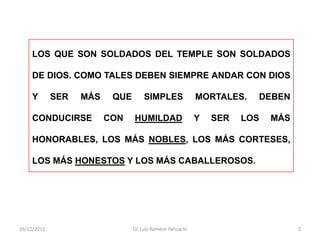 El documento expone los principios y valores que deben seguir los soldados del Templo, enfatizando la humildad, el honor y la justicia. Un templario debe servir a la orden sin esperar recompensas y actuar como un ejemplo de caballerosidad para todos, sin causar daño. Se subraya la búsqueda de la verdad y la conducta ética, donde no se permite la brutalidad, la inmoralidad o el juicio superficial de otros.