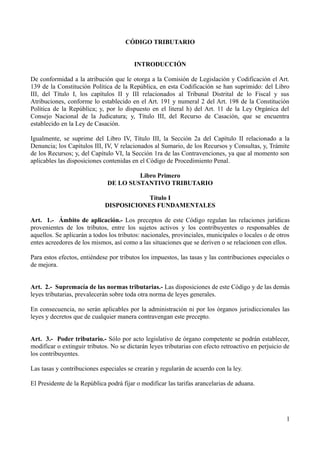Este documento presenta una introducción y el Título I del Código Tributario ecuatoriano. La introducción explica las secciones que se han suprimido del código. El Título I contiene 14 artículos que establecen disposiciones fundamentales sobre la aplicación del código, la supremacía de las normas tributarias, el poder tributario, la reserva de ley, los principios tributarios, los fines de los tributos, la facultad reglamentaria y la interpretación de la ley tributaria.