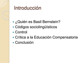 El documento resume la teoría del sociólogo Basil Bernstein sobre los códigos lingüísticos y su aplicación a la educación. Bernstein propuso que existen dos tipos de códigos - restringido y elaborado - que se asocian con clases sociales. También describió cómo la clasificación y enmarcación en el currículum escolar pueden reforzar las desigualdades sociales. Finalmente, criticó los modelos de educación compensatoria por distraer la atención de problemas estructurales.