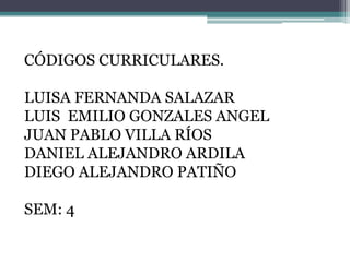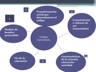 Este documento presenta un resumen de los diferentes códigos curriculares a lo largo de la historia, incluyendo el código clásico, realista, moral y racional. Cada código se caracteriza por su enfoque en áreas de conocimiento, demandas sociales y la relación entre educación y sociedad en su época.