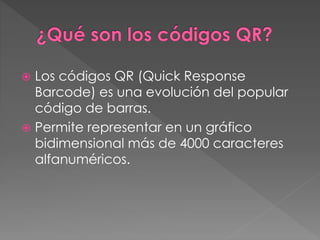 Los códigos QR son una evolución del código de barras que permite representar más de 4000 caracteres en un formato bidimensional. Inicialmente se usaban en la industria automotriz, pero ahora son comunes en muchos sectores para compartir información visualmente. Para leer un código QR se necesita un dispositivo con cámara, como la mayoría de teléfonos móviles actuales. Existen numerosas aplicaciones y servicios en línea que permiten generar y leer códigos QR de forma sencilla.