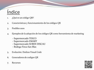 El documento describe el código QR, su desarrollo por Denso Wave en 1994 y sus características, usos en marketing y evolución hacia el dotless visual code. Se presentan casos de éxito en supermercados que implementaron códigos QR para aumentar ventas y ofrecer servicios innovadores. Además, se mencionan generadores de códigos QR y recursos para su creación.