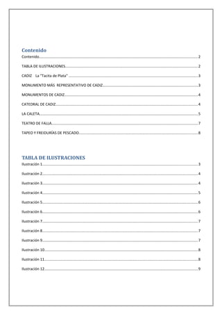 Este documento proporciona información sobre la ciudad de Cádiz, España. Brevemente describe la historia de Cádiz como la ciudad más antigua de Occidente fundada por los fenicios, y destaca algunos de sus monumentos más importantes como la Catedral de Cádiz y la Constitución de 1812. También presenta algunas características culturales de Cádiz como el Carnaval y la comida típica de pescado frito.