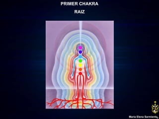 El documento proporciona información sobre los primeros cinco chakras: el chakra raíz se relaciona con la familia y la supervivencia básica; el chakra sacro se relaciona con la sexualidad, el poder y las relaciones; el chakra plexo solar se relaciona con la personalidad y la autoestima; el chakra del corazón se relaciona con el amor incondicional; y el chakra de la garganta se relaciona con la voluntad y el libre albedrío.