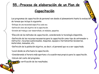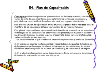 El documento describe las etapas clave para desarrollar un plan de capacitación efectivo para los empleados de una empresa. Incluye determinar las necesidades de capacitación actuales y futuras a través de evaluaciones de desempeño y encuestas, programar la capacitación en términos de objetivos, contenido y métodos, y evaluar los resultados de la capacitación.