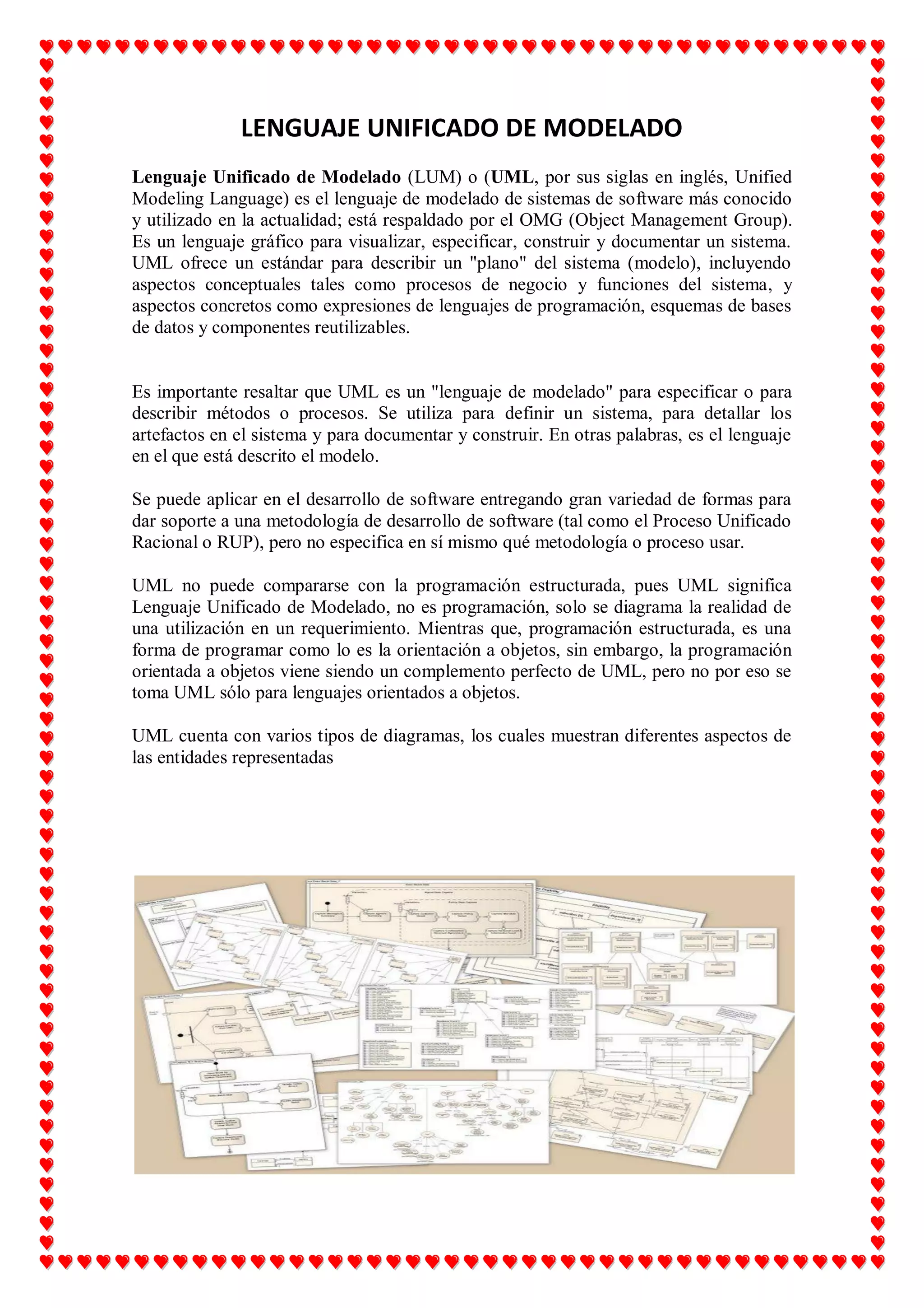 UML (Lenguaje Unificado de Modelado) es un lenguaje gráfico para modelar sistemas de software respaldado por el OMG. Permite visualizar, especificar, construir y documentar un sistema mediante diagramas que representan diferentes aspectos como procesos, funciones, bases de datos y componentes. Aunque se usa comúnmente con desarrollo orientado a objetos, UML es independiente de cualquier metodología en particular y ofrece diferentes tipos de diagramas para modelar estructuras y comportamientos de un sistema.