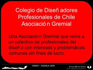 El documento describe la situación actual de la profesión y la educación del diseño en Chile. Señala que hay una gran cantidad de diseñadores pero poca calidad, y que el diseño chileno no ha logrado posicionarse ni integrarse plenamente en las empresas. También indica que hay poca promoción y difusión del diseño en Chile, y que el gobierno brinda poco apoyo a la profesión. El documento hace un llamado a fortalecer la asociación gremial de diseñadores para mejorar la situación.