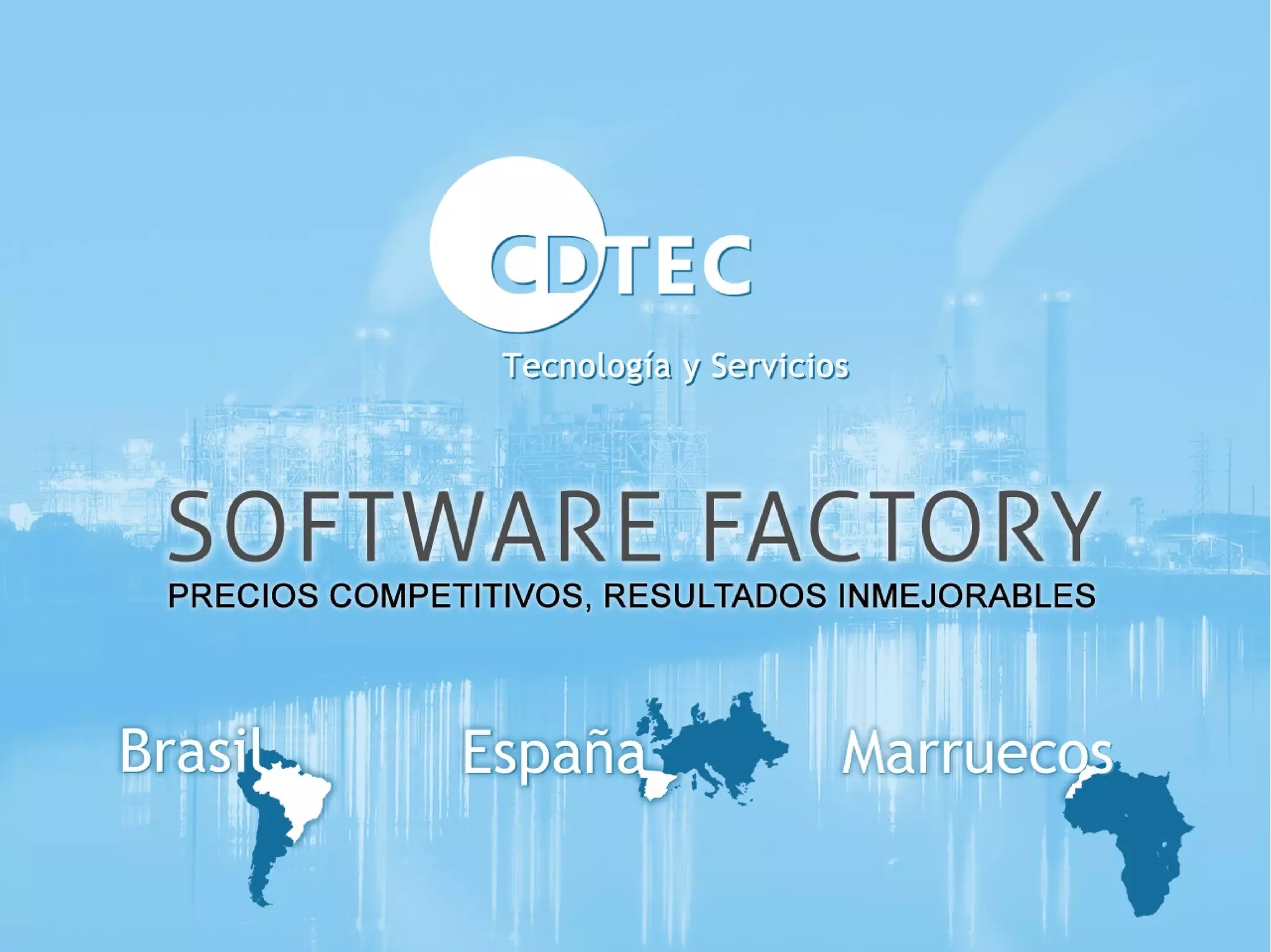 Este documento presenta a CDTEC como una fábrica de software que ofrece sus servicios de desarrollo de software a pequeñas y medianas empresas de tecnología de la información y la comunicación. CDTEC tiene sedes en Sevilla, Rabat y Sao Paulo y emplea analistas y técnicos cualificados para integrarse en los equipos de desarrollo de sus clientes y ayudarlos con sus proyectos de software de manera flexible y a precios competitivos.