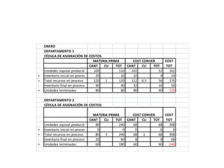 Este documento contiene cédulas de asignación de costos de dos departamentos para los meses de enero y febrero. Resume la información sobre unidades producidas, costos de materia prima, mano de obra y costos indirectos asignados a cada departamento y período.