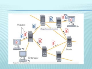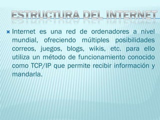 Internet es una red mundial que permite el intercambio de información entre ordenadores a través de protocolos como TCP/IP. Se identifican los dispositivos con direcciones IP y nombres de dominio, y los usuarios se comunican a través de correo electrónico y páginas web mediante direcciones URL. La información se transmite en paquetes a través de varios nodos de la red para garantizar su entrega.