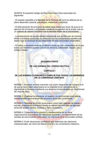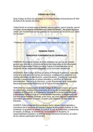 Este documento presenta el Código de Ética de la Universidad Nacional Experimental Politécnica de la Fuerza Armada Nacional. Establece normas de conducta para todos los miembros de la comunidad universitaria, incluyendo el personal académico, administrativo y los estudiantes. Promueve valores como la dignidad humana, el respeto, la tolerancia y la honestidad. Además, detalla deberes específicos para cada grupo, como el deber del personal académico de enseñar con integridad y el de los estudiantes de aprender y