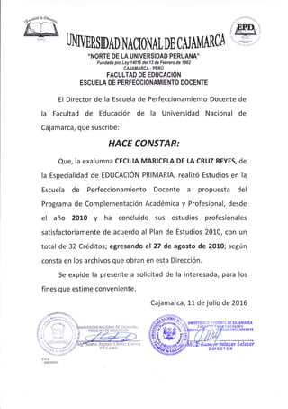 Este documento certifica que Cecilia Maricela de la Cruz Reyes completó con éxito sus estudios en la Escuela de Perfeccionamiento Docente de la Facultad de Educación de la Universidad Nacional de Cajamarca en Perú. Obtuvo un total de 32 créditos y se graduó el 27 de agosto de 2010 como parte del Programa de Complementación Académica y Profesional. El director de la Escuela emite este documento a solicitud de la interesada para los fines que considere oportunos.