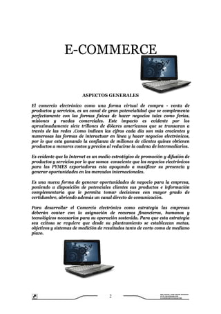El documento describe aspectos generales del comercio electrónico y su potencial para las pequeñas y medianas empresas exportadoras. Explica que el comercio electrónico es una forma virtual de compra y venta de productos y servicios a través de Internet que complementa las formas físicas de hacer negocios. También analiza el proceso necesario para realizar comercio electrónico de manera exitosa.