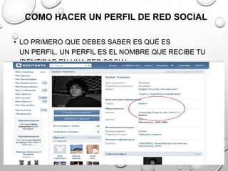 El documento proporciona instrucciones sobre cómo crear un perfil en una red social. Explica que un perfil es la identidad de un usuario en una red social y requiere datos personales como nombre, ciudad y aficiones. Luego, detalla los pasos específicos para crear un perfil en Facebook, que incluyen registrarse con nombre, correo electrónico y contraseña, agregar información de seguridad y personal, y subir una foto de perfil.