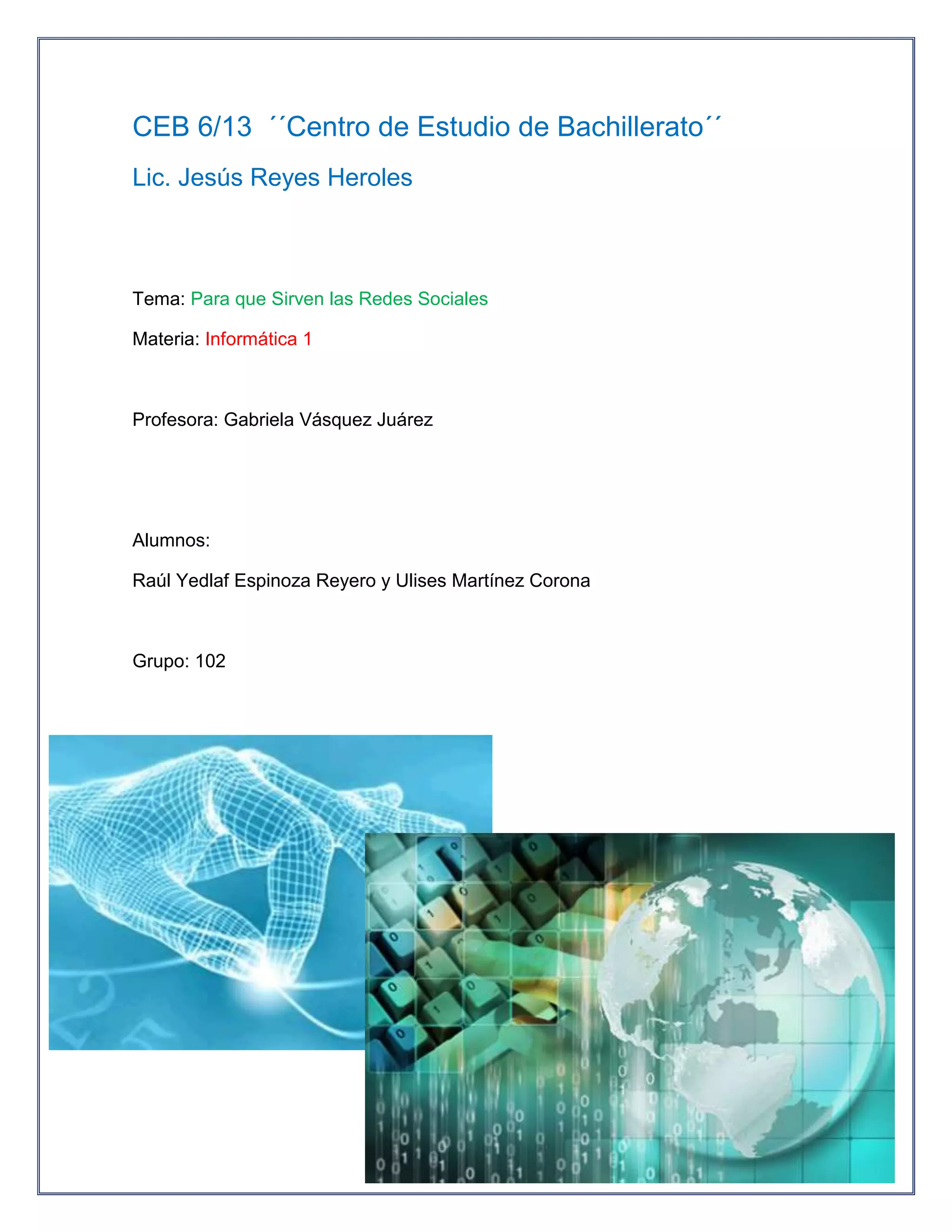 El documento discute el tema de las redes sociales y su importancia. Explica que las redes sociales conectan a personas a través de amistades, intereses y comunidades. También describe algunas redes sociales populares como Facebook y cómo estas redes satisfacen necesidades humanas de comunicación e interacción social. Finalmente, resalta el gran impacto de las tecnologías de la información y comunicación como Internet y los teléfonos celulares en mantener a las personas conectadas.