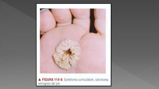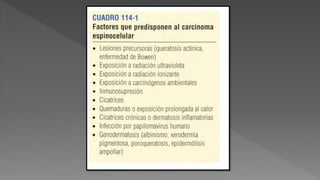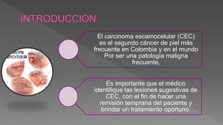 El carcinoma escamocelular (CEC) es el segundo cáncer de piel más frecuente. Se desarrolla a partir de queratinocitos en la piel o mucosas y puede ser in situ u invasor. Es importante identificar lesiones sugestivas de CEC de manera temprana para brindar tratamiento oportuno, ya que aunque casi siempre es curable en estadios iniciales, puede propagarse si no se trata. Las queratosis actínicas son las principales lesiones precursoras.