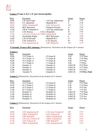 Este documento presenta el calendario de competición para el Torneo Nacional Prebenjamín que se celebrará en Valladolid los días 14 y 15 de mayo de 2011. El torneo consta de 4 grupos (A, B, C, D) y un grupo de promoción. El primer día se jugarán partidos de todos los grupos. El segundo día serán eliminatorias para determinar las posiciones finales.