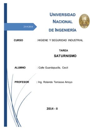 El documento describe los efectos del saturnismo causado por la exposición al plomo. Explica que el plomo se ha utilizado históricamente y puede encontrarse en edificios, soldaduras y combustibles. La principal vía de exposición es la inhalación, y la absorción de plomo depende del tiempo y concentración de exposición. El plomo afecta la sangre, sistema nervioso, riñones, reproducción y huesos, causando anemia, problemas neurológicos, insuficiencia renal, complicaciones en el embarazo