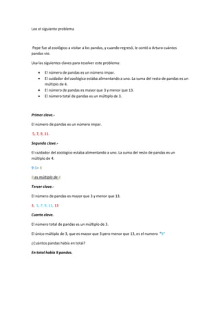 Este documento presenta un problema sobre el número de pandas que Pepe vio en el zoológico y las claves para resolverlo. El problema se resuelve determinando que había un total de 9 pandas basado en las claves de que el número era impar, mayor a 3 y menor a 13, y un múltiplo de 3.