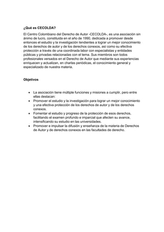 CECOLDA es el Centro Colombiano del Derecho de Autor, una asociación sin ánimo de lucro constituida en 1990 dedicada a promover el estudio y protección de los derechos de autor y derechos conexos. Sus objetivos principales son promover el estudio e investigación para lograr un mejor conocimiento y protección efectiva de los derechos de autor, fomentar su estudio y progreso, y promover la enseñanza de esta materia en las facultades de derecho.