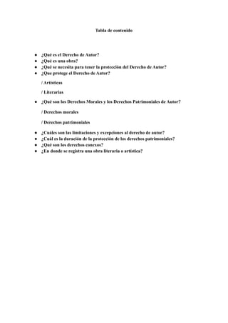 Este documento resume los conceptos clave del derecho de autor, incluyendo que protege las obras literarias y artísticas originales sin necesidad de registro aunque este sirve como prueba, y que los derechos de autor incluyen derechos morales y patrimoniales. También cubre temas como las limitaciones al derecho de autor, la duración de la protección y donde registrar una obra.