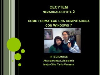 Para formatear una computadora con Windows 7, primero se enciende la PC y se accede al BIOS presionando una tecla. Luego se elige iniciar desde el DVD de Windows 7 y se espera a que sea reconocido. Se instalan los archivos necesarios y se configuran parámetros como idioma, formato y teclado. Finalmente, se instala Windows 7 solicitando un nombre de usuario, contraseña y otros detalles personales.