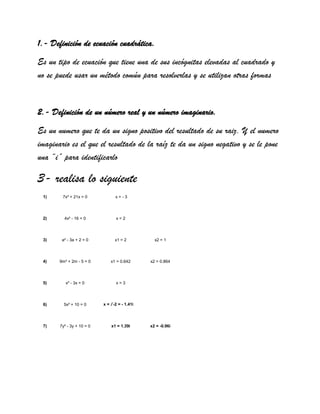 Este documento contiene un trabajo final de álgebra que incluye definiciones de ecuaciones cuadráticas y números reales e imaginarios, ejercicios de resolución de ecuaciones cuadráticas y sistemas de ecuaciones, gráficas de funciones lineales y resolución de polinomios de diferentes grados y un ejemplo de suma algebraica para calcular el perímetro de un terreno.