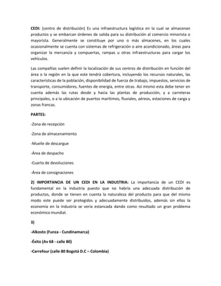 Los centros de distribución (CEDI) almacenan productos y preparan pedidos para su distribución al comercio minorista y mayorista. Generalmente incluyen almacenes y áreas para organizar mercancía, cargar vehículos y preparar pedidos. Las compañías consideran factores como la ubicación, infraestructura, transporte y mercado al establecer sus CEDI para optimizar la distribución de productos.