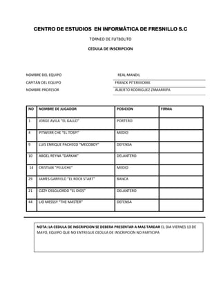 Este documento es la cédula de inscripción para el equipo de fútbol "Real Mandil" en el Centro de Estudios en Informática de Fresnillo. Presenta el nombre del equipo, su capitán Franck Piter, el profesor responsable Alberto Rodríguez Zamarripa, y la lista de 11 jugadores con sus posiciones y firmas. Se debe entregar a más tardar el viernes 13 de mayo para que el equipo pueda participar.