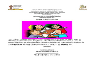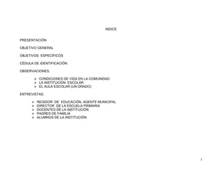 El documento presenta una cédula de observación etnográfica y entrevistas semiestructuradas para realizar una investigación educativa en 4 escuelas primarias de las zonas escolares 68 y 127 de Cd. Ixtepec, Oaxaca. El objetivo general es obtener información sobre los retos y desafíos que enfrentan las instituciones educativas en su contexto. Los objetivos específicos incluyen documentar la calidad de vida de la población, registrar las condiciones de la infraestructura escolar y docentes, conoc