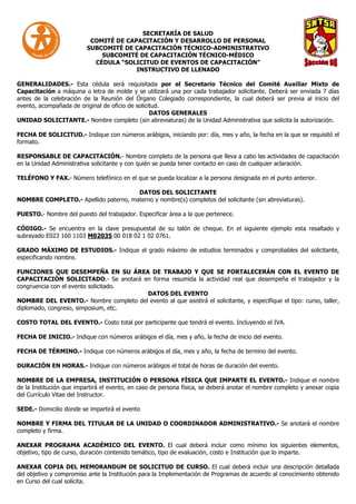 Este documento presenta un formato de solicitud de eventos de capacitación para la Secretaría de Salud. El formato solicita información general sobre la unidad solicitante, el solicitante, y los detalles del evento de capacitación incluyendo el nombre, costo, fechas, duración e institución que lo imparte. Instruye cómo completar cada sección del formato y qué documentos adjuntar como el programa académico y una carta de solicitud del curso.